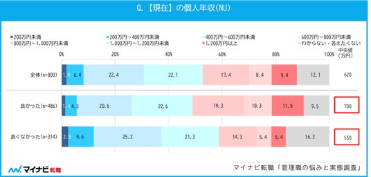 ◆ 管理職になって金銭待遇が良くなった人は約8割。管理職になって良かった人の年収中央値は700万円で、良かったと感じていない人とは150万円の差