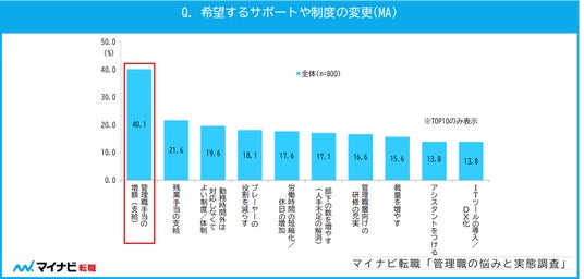また、管理職を続けていくうえで希望するサポートや制度は、「管理職手当の増額」(40.1%)が最も多く、次いで「残業手当の支給」(21.6%)が挙がった。【図8】
