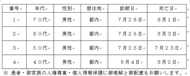 2021-08-07 東京都 新型コロナウイルスに関連した患者の死亡について Tweet ~新型コロナウイルスに関する東京都からのお知らせ~ 都内で新型コロナウイルスに感染した方が死亡されましたのでお知らせします。 お亡くなりになった方のご冥福をお祈り申し上げます。 企業プレスリリース詳細へ PR TIMESトップへ 公式ツイッター Follow @Straightpress 最新情報をTwitterで受け取ろう! 公式フェイスブックページ 最新情報をFacebookで受け取ろう! 前の記事 一覧へ戻る 次の記事