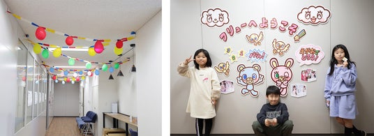 会場の装飾は運営を担当した従業員が心を込めて準備しました。“こころ おどる”出来栄えは、プリ機やキャラクター商品を扱うフリューならでは。会場入り口には本イベントのオリジナルキャラクターのポップがお出迎えし、参加者はフォトスポットとして思い出を残していました。また、廊下の天井を彩るカラフルなガーランド装飾には、本来廃棄されるはずのプリントシール機の素材を活用しました。