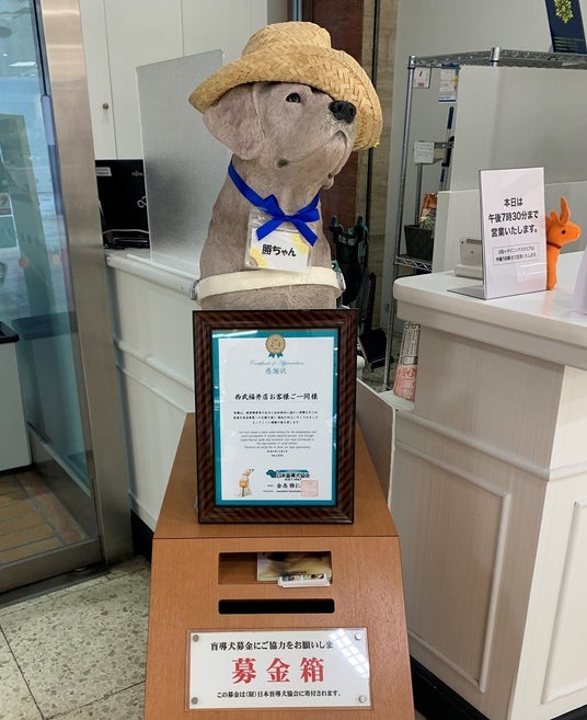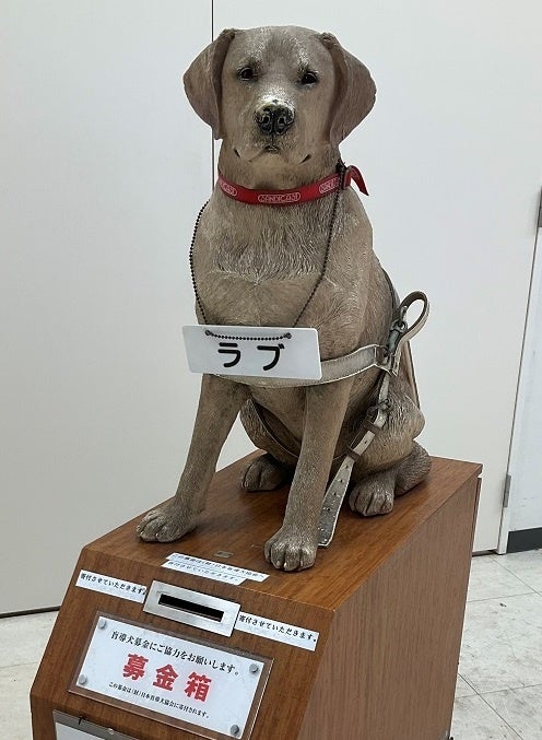 そごう大宮店 等身大のラブラドール犬型の募金箱にはお客さまや従業員から募集したネームプレートを付けています