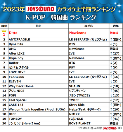 初登場で首位に輝いたNewJeans「Ditto」を筆頭に、2022年以降にカラオケ配信された楽曲が、TOP20に13曲もランクイン!BTS「Dynamite」、PSY「カンナム スタイル」などの定番曲だけでなく、1位のNewJeansを筆頭に、LE SSERAFIM、NMIXXをはじめとしたデビューしたばかりのグループが存在感を示しました。K-POP/韓国曲では、TikTokをはじめとしたSNSの「ダンス動画」で人気の曲が上位を占める傾向に。