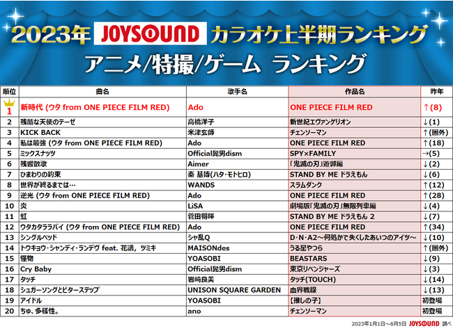 高橋洋子「残酷な天使のテーゼ」を2位に抑え、圧倒的な歌唱力で絶大な支持を集めているAdo「新時代 (ウタ from ONE PIECE FILM RED)」が首位を獲得!映画『ONE PIECE FILM RED』の主題歌・劇中歌を含む、4曲がTOP20にランクインしました。『チェンソーマン』のオープニングテーマの米津玄師「KICK BACK」は、圏外から急上昇し3位を獲得、エンディングテーマのano「ちゅ、多様性。」も、初登場でTOP20入りを果たしました。