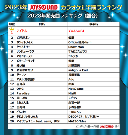 株式会社エクシング(本社:名古屋市瑞穂区、代表取締役社長:水谷 靖)は、業界最多34万曲(※1)以上の配信曲数を誇る業務用通信カラオケ「JOYSOUND」シリーズ、および「UGA」シリーズにて歌唱された楽曲の回数に基づき集計した「2023年JOYSOUNDカラオケ上半期ランキング」(※2)を、本日6月15日(木)に発表します。さらに、特設ページでは、2023年発売曲ランキング(総合)で1位を獲得したYOASOBIのお二人からのコメントも公開しております。