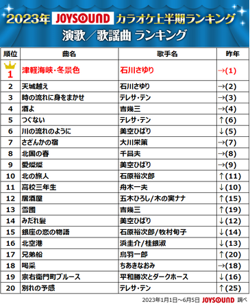 2023年、デビュー50周年を迎えた石川さゆりがリリースした記念アルバム『Transcend』にもリアレンジ版が収録されている「津軽海峡・冬景色」「天城越え」の2曲が上位を独占!このほか、テレサ・テン「時の流れに身をまかせ」、吉幾三「酒よ」をはじめ、往年の名曲が変わらぬ人気を示す結果となりました。