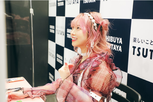 まこりんグッズを身につけた男性ファンに「そのパーカー、似合ってるね」と声をかけたり、今日のためにおめかしをして来てくれた女性ファンと久しぶりに会った友達のように話したりと、もちろん今回が初めましてというファンもいるなか、限られた時間のなかで、ひとりひとりとしっかり向き合って、今回のイベント限定生写真にその場で宛名を入れながら、心を込めてまこりん自ら特典とフォトブックをお渡ししていく。