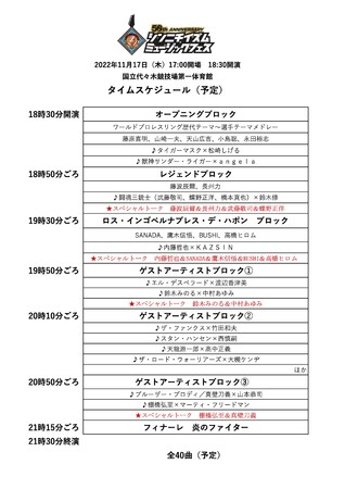 続いての18時50分ごろからの“レジェンドブロック”には、藤波辰爾、長州力、武藤敬司、蝶野正洋が入場曲の生演奏で登場!4人によるスペシャルトークが行われる。