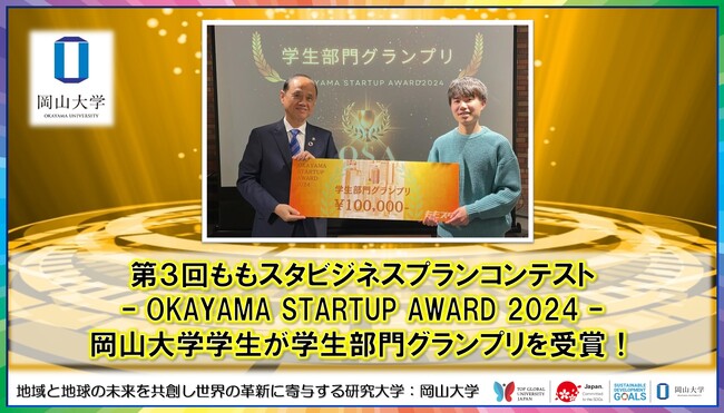 岡山市が運営するスタートアップ支援拠点「ももたろう・スタートアップカフェ」(ももスタ)が2024年3月23日に開催した「第3回ももスタビジネスプランコンテスト - OKAYAMA STARTUP AWARD 2024 -」において、工学部3年の大西一碧さんが学生部門グランプリを受賞しました。