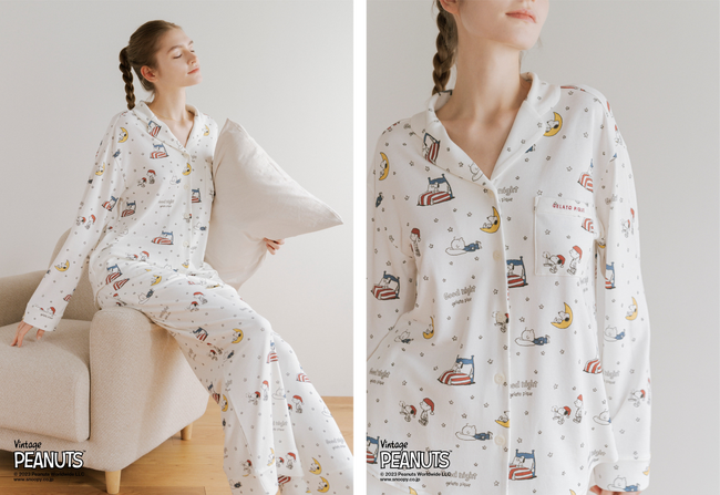ベッドの上にいるスヌーピーのぬいぐるみのアートは、ジェラート ピケオリジナルで描き起こしたベッドタイム柄です。同シリーズでワンピースもラインアップしています。