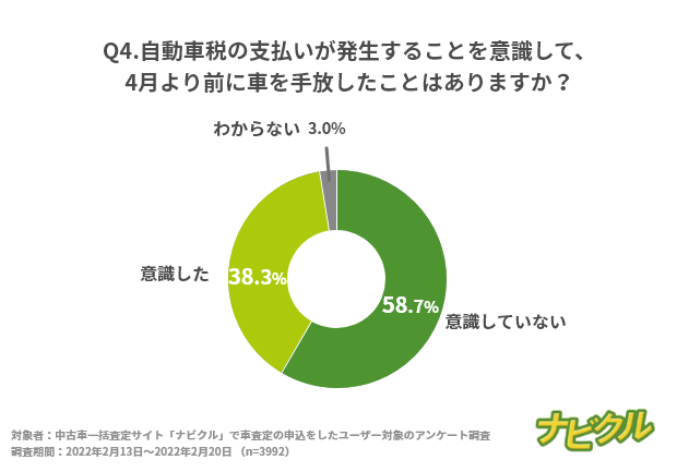 自動車税は、4月1日時点で車検証上の所有者に対して自動的に発生する税金です。車を手放したことがある方に、自動車税の支払いが発生することを意識して4月より前に車を手放したか質問したところ、「意識していない」と答えた方は58.7%、「意識した」と答えた方は38.3%という結果になりました。自動車税の支払いが発生するタイミングを意識していない方のほうが多いのが現状ですが、支払い発生前に車を手放すと一時的な出費が抑えられ、面倒な手続きをなくすことができます。