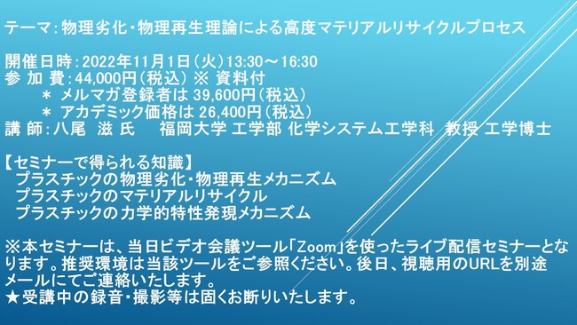 先端技術情報や市場情報を提供している(株)シーエムシー・リサーチ(千代田区神田錦町: https://cmcre.com/ )では、 各種材料・化学品などの市場動向・技術動向のセミナーや書籍発行を行っておりますが、 このたび「物理劣化・物理再生理論による高度マテリアルリサイクルプロセス」と題するセミナーを、 講師に八尾 滋 氏 福岡大学 工学部 化学システム工学科 教授 工学博士)をお迎えし、2022年11月1日(火)13:30より、 ZOOMを利用したライブ配信で開催いたします。 受講料は、 一般:44,000円(税込)、 弊社メルマガ会員:39,600円(税込)、 アカデミック価格は26,400円(税込)となっております(資料付)。