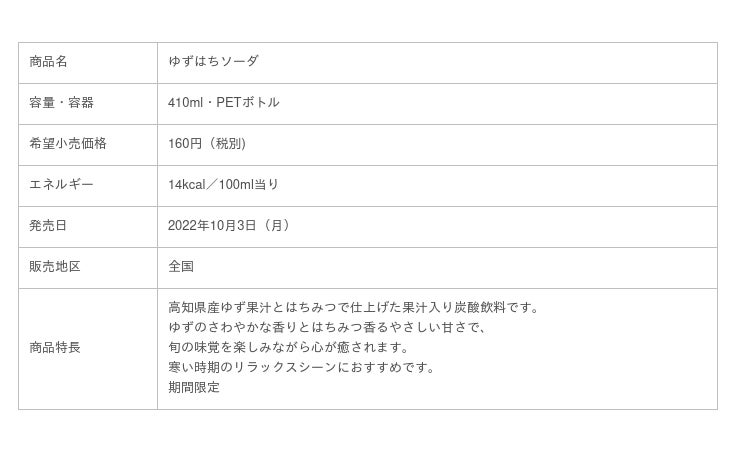 近年お客様の間では、国産素材を選びたいという意識や、産地応援への関心も高まっています※1。高知県は年間の日照時間が2,000時間を超え温暖で、雨が多く朝と夜の寒暖差のある気候がゆずの栽培に適しており、おいしいゆずが育ちます。冬に旬を迎えるゆずは、5割以上※2が高知県で生産されており、生産量も全国1位と、高知県はゆずの名産地です。この度新発売する「ゆずはちソーダ」は、この高知県産ゆず果汁(JA高知市)とはちみつで仕上げた、炭酸飲料です。季節の変わり目に、旬を先取りしたゆず果汁入りの炭酸飲料を新たに発売することで、高知県産のゆずのおいしさを全国にお届けしたいと考えました。ホッと一息つきたい気持ちに寄り添うような、ゆずの爽やかな香りと、はちみつ香るやさしい甘さが、寒くなる季節のリラックスシーンにおすすめの商品です。