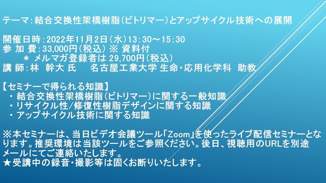 先端技術情報や市場情報を提供している(株)シーエムシー・リサーチ(千代田区神田錦町: https://cmcre.com/ )では、 各種材料・化学品などの市場動向・技術動向のセミナーや書籍発行を行っておりますが、 このたび「結合交換性架橋樹脂(ビトリマー)とアップサイクル技術への展開」と題するセミナーを、 講師に林 幹大 氏 名古屋工業大学 生命・応用化学科 助教)をお迎えし、2022年11月2日(水)13:30より、 ZOOMを利用したライブ配信で開催いたします。 受講料は、 一般:33,000円(税込)、 弊社メルマガ会員:29,700円(税込)、 アカデミック価格は<アカ>となっております(資料付)。