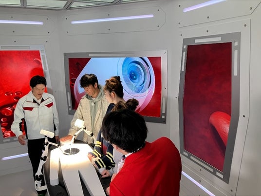 遠隔操作で手術が行える「フライングオペレーションユニット」など、その驚くべき技術に3人はビックリ!