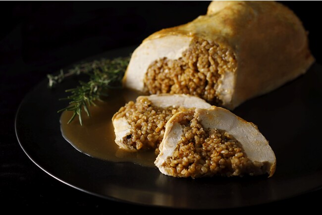 味の深みと弾力ある食感が特徴の「はかた一番どり」を丸ごと使用し、スパイシーに味付けをしたホテルオリジナル雑穀米「Jシリアル」を詰めじっくりとローストした旨味溢れる『はかた一番どりのJシリアル入り丸ごとローストチキン』。360°の圧倒的なパノラマ眺望とともに、全50種類以上の料理をお愉しみいただけるビュッフェダイニングでご堪能ください。