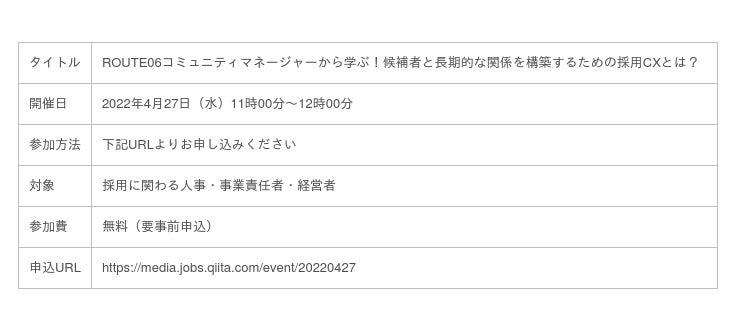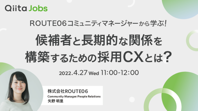 株式会社エイチームのグループ会社であるQiita株式会社(本社:名古屋市中村区、代表取締役社長:柴田健介)は、無料オンラインセミナー「ROUTE06(ルートシックス)コミュニティマネージャーから学ぶ!候補者と長期的な関係を構築するための採用CXとは?」を2022年4月27日(水)に開催します。