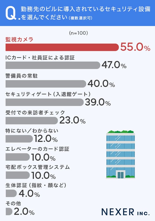 55%が「監視カメラ」、47%が「ICカード・社員証による認証」、40%が「警備員の常駐」、39%が「セキュリティゲート(入退館ゲート)」と回答しました。