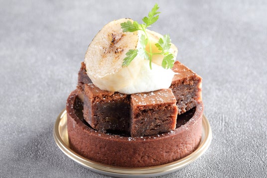 濃厚なチョコレートとバナナのやさしい甘さが良く合う、新作スイーツ。チョコレートのタルト生地にキャラメリゼをしたバナナを入れ、バナナとクルミのブラウニー、バナナをトッピングしました。