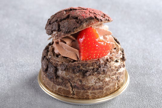 ココアを練り込んだシュー生地に、フランボワーズ風味のカスタードクリームを詰め、いちご味のチョコレートクリームといちごを飾った新作のシュークリームです。