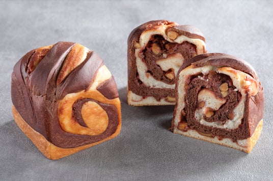プレーン生地とココア生地でぐるぐる模様に仕上げたかわいいキューブ型のパン。もっちりとした食感のパン生地に、いちごクリームとクラッシュアーモンドをたっぷり加え、焼き上げました。