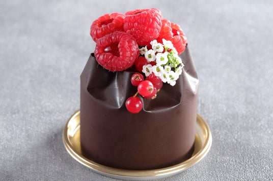 花束をイメージしデコレーションした、プレゼントにおすすめのチョコレートケーキ。ココアのスポンジ生地、チョコレートガナッシュ、チョコレートムースを層にしたケーキをスイートチョコレートでラッピングし、ベリーを添えました。