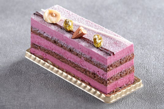 ヘーゼルナッツチョコを塗ったチョコレート生地とカシスの実入りカシスチョコレートムースを層に仕上げた綺麗な色合いのムースケーキ。カシスの酸味とチョコレートの甘みの絶妙なバランスを