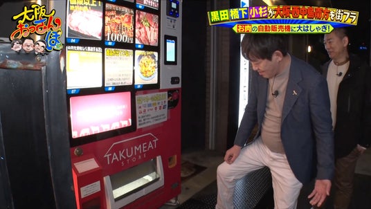 続いて訪れたのは「肉中島レジャービル」という変わり種ビル。1階から3階まで、すべてが肉にまつわる店舗で、1階には肉の自動販売機「1000円肉くじ」が。1000円よりもお得な高級肉が当たるかも!? と大興奮!