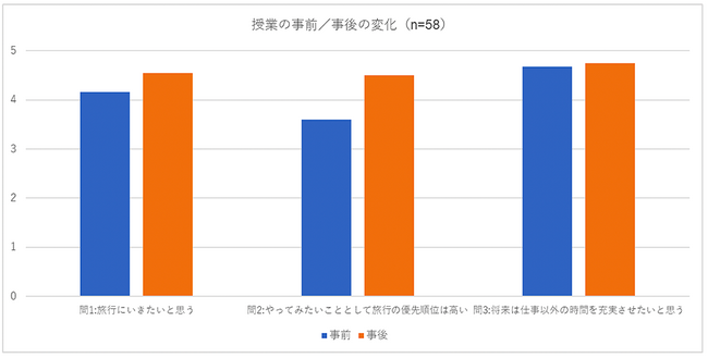 授業において、生徒たちにアンケートを行いました。「旅行に行きたいと思う」という質問に5段階で回答してもらった結果(※)、授業前は平均4.16点だったのに対し、授業後は4.55点となり、旅行意向が増したことが分かりました。さらに、「やってみたいこととして旅行の優先順位は高い」という質問に対しては、授業前は平均3.6点だったものが、授業後は4.5点に増加しました。また、「将来は仕事以外の時間を充実させたいと思う」という質問に対しては、授業前は平均4.68点だったものが、授業後は4.75点となりました。生徒からは「自分が思っている好みとはまったく別の結果で驚きました。結果を見ると、確かに自分の行きたい旅行の種類だったと思いました」「好きなことから自分に合っている旅行が見つけ出せて楽しかった。あまり旅行に行くことがないので、これからたくさん行きたいと思った」「将来仕事以外の余暇も充実させるようにしたいです」などの声があり、授業に参加したことでキャリアにおける余暇の大切さや旅行への意欲が高まり、選択肢が広がった様子がうかがえます。