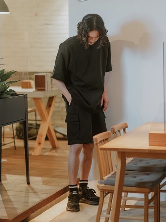 〈fuu/project / フープロジェクト〉スウェットTシャツ002 16,500円、カーゴショーツ 16,500円
