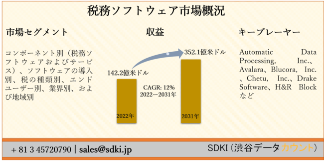 税務ソフトウェア市場は、2022年に142.2億米ドルの市場価値から、2031年までに352.1億米ドルに達すると推定され、2022-2031年の予測期間中に12%のCAGRで成長すると予想されています。