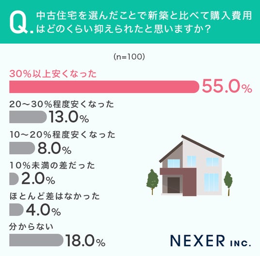 中古住宅を選んだことで、新築と比べて購入費用が30%以上安くなった方が半数以上いました。