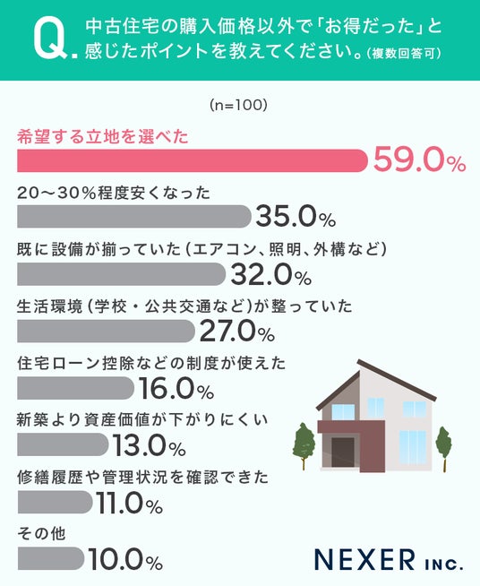 ■59%が、中古住宅の購入価格以外で「お得だった」と感じたポイントは「希望する立地を選べたこと」と回答