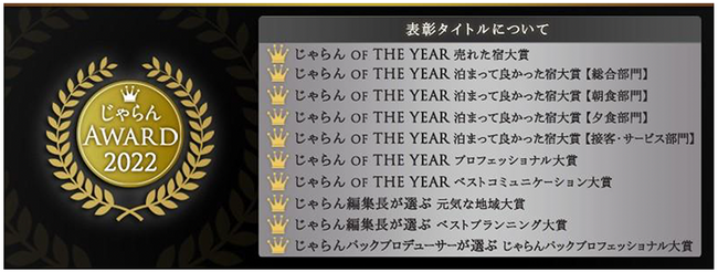 『じゃらん』は、その年度に顕著な実績を収めた宿泊施設や地域を表彰する目的で2012年に「じゃらんアワード」の表彰・発表を開始しました。「じゃらんアワード2022」で10回目の表彰・発表となります。『じゃらん』は、サービス開始当時より、宿泊施設・地域の魅力を発掘・発信してきましたが、宿泊施設の優れた取り組みを共有し表彰することで、多くの方に宿泊施設の魅力を伝え、旅行業界の進化・発展に寄与したいとの思いで「じゃらんアワード」を開催しています。
