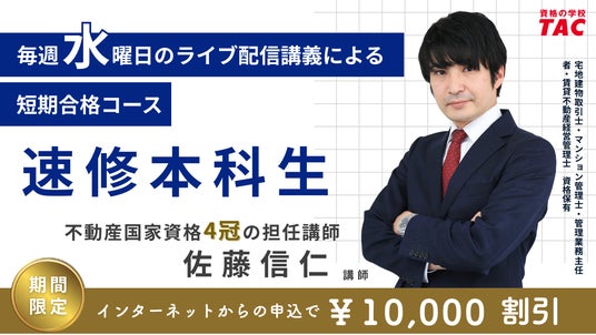 宅建士試験対策講座を展開しているTAC株式会社(東京都千代田区、代表取締役:多田敏男)は、3/11(水)に短期合格コース速修本科生(水曜クラス)のオンラインライブ通信講座の販売を開始します。