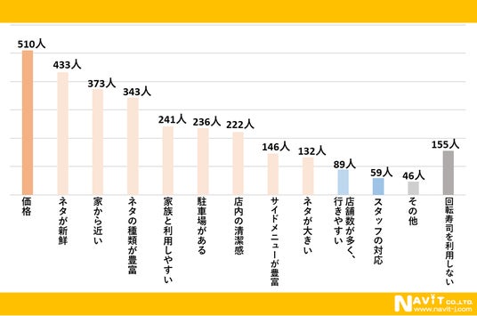 「回転寿司を選ぶ際に重要視している点は何ですか?」という質問を複数選択可で行ったところ、「価格」が510人、「ネタが新鮮」が433人、「家から近い」が373人と続きました。安くて美味しいお店が最高ですよね。