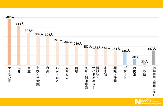 「回転寿司でよく注文するメニューのジャンルはどれですか?」という質問を複数選択可で行ったところ、「サーモン系」が486人、「赤身」が413人、「軍艦」が343人と続きました。サーモン系が人気のようです。