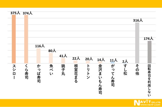 「よく利用する回転寿司店はどこですか?」という質問を複数選択可で行ったところ、「スシロー」が375人、「くら寿司」が374人、「かっぱ寿司」が116人と続きました。スシローとくら寿司を利用している人が多いようです。