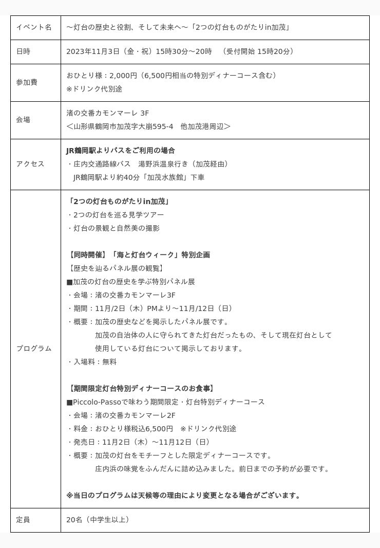 海と日本プロジェクトin山形は、”~灯台の歴史と役割、そして未来へ~「2つの灯台ものがたりin加茂」”を11月3日(金・祝)に開催いたします。このイベントは、日本財団「海と日本プロジェクト」の一環として、灯台を中心に地域の海の記憶を掘り起こし、地域と地域、異分野と異業種、日本と世界をつなぎ、新たな海洋体験を創造していく「海と灯台プロジェクト」の協力により開催します。