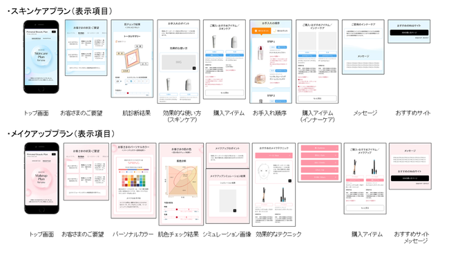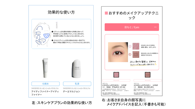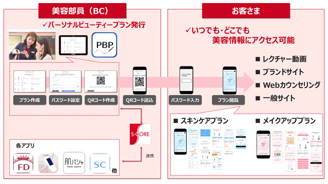 「パーソナルビューティープラン」は、お客さまに寄り添い美しさを引き出す“美のパートナー”であるBCとデジタルの利便性をつなぎ、充実した美容体験を提供するサービスです。応対の記録を2次元コード(QRコード)で発行することで、お客さまの肌状態に合わせた効果的なお手入れ方法や、手書きによるメイク方法に加え、URL添付機能によるおすすめ商品情報やブランド情報、使い方動画などのコンテンツ視聴やWebカウンセリング予約などを可能にしました。これによりお客さまは、店頭外でもパーソナルな美容情報の体験ができるようになります。