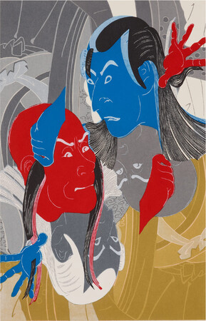 ↑「摺れ摺れ草-二代目沢村淀五郎の川蓮法眼と初代板東善次の鬼佐渡坊」38.7×24.8cm、木版画