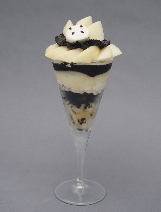 旬の洋梨を使用し、バニラアイスとブラックココアモンブランクリームを合わせて飾り付けたパフェ。