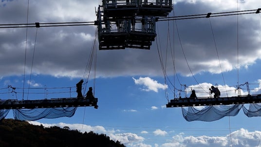 およそ20人の職人たちが挑んだのは無理難題だらけの工事…。一般的なつり橋は、ワイヤがまっすぐ下に伸びていますが、この橋はV字型。普通は足場を作って工事をしますが、特殊な形をしているため、足場を組むことができないといいます。ロープにぶら下がりながらの作業は、まるでサーカスのよう。職人たちは「空中作戦」と呼びます。高さ50メートル超。膝が震えそうな高さでの工事の途中、橋げたに大きなすき間ができるトラブルが発生しました。職人たちが編み出したある解決策とは?
