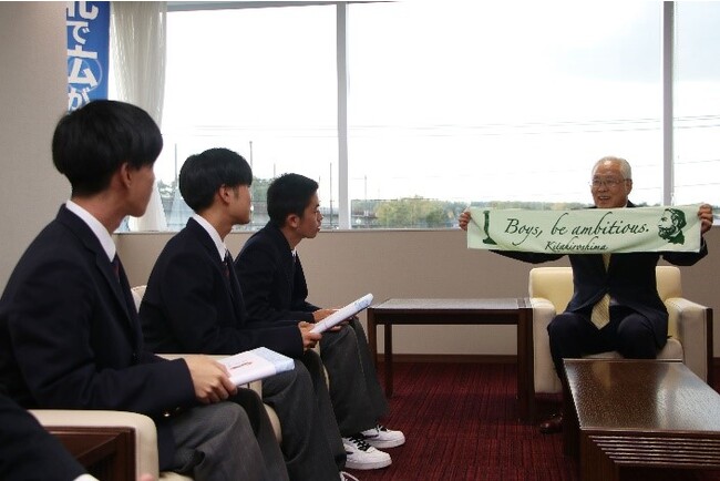 2023年9月10日に行われた『スポGOMI甲子園2023・北海道大会』で優勝した札幌日本大学高等学校(北海道北広島市、校長:浅利剛之)在校生3人組の「のりのりとものり」が、大会での成果を報告するため北海道 北広島市 上野正三市長を表敬訪問しました。