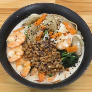 納豆の粘りとココナッツミルクのバランスが抜群! 根菜もたくさんで、夜遅くに食べても「罪悪感のない」ラーメンなっています。ダイエット中の方にも、がっつり好きの方にもおすすめのメニューです。