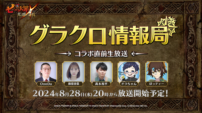 ネットマーブルは、 スマートフォン向けシネマティックアドベンチャーRPG『七つの大罪 ~光と闇の交戦(ひかりとやみのグランドクロス)~』(略称:グラクロ)の公式WEB番組「第59回グラクロ情報局~コラボ直前生放送~」を、8月28日(水)20:00より、生放送することをお知らせいたします。
