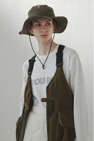Snow Peakの次世代タープである"ランドステーション"を描いたグラフィックTシャツを別注。グレーを基調に、パープルとサックスが新鮮な色合わせは、爽やかな空気感を連想させます。左袖口にはemmiのネームを入れた特別使用。素材はコットンとエコポリエステルを使用したサステナブルな一枚です。