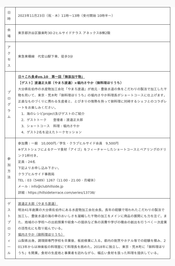 2022年、海のレシピprojectは「磯焼け」「未利用魚」に着目し、やまろ渡邉と「豊後水道のアイゴの一夜干し」を共同開発・商品化しました。本イベントではこの無添加のアイゴの干物を用いたお料理をご賞味いただきます。