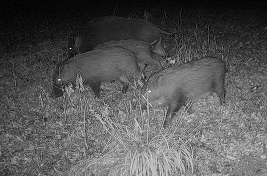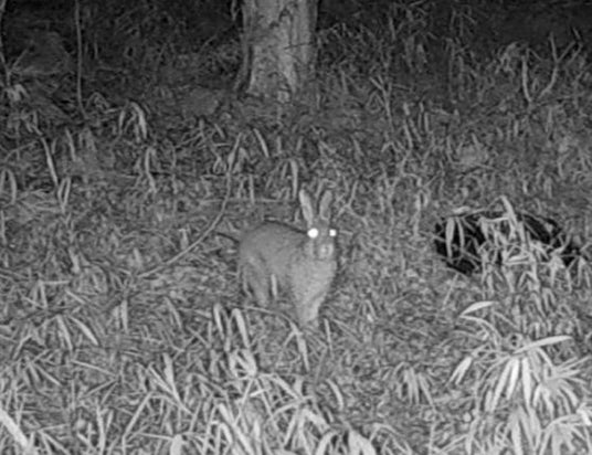 森内に設置した動物センサーカメラで夜間撮影されたイノシシ(左)、ニホンノウサギ(右)