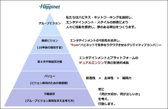 ■実施背景当社は2022年4月より、10年後の目指すべき姿であり、”from”ハピネット(ハピネット発信)で世界をワクワクさせるエンタテインメントを発信することを目指した「長期ビジョン」と、長期ビジョン達成のための最初の3か年の取り組みとして、「第9次中期経営計画」を掲げ、事業を推進しています。また、これらのビジョン実現のために全社員が持つべき価値観である「バリュー」として、“世界をワクワクさせる”を支える私たちの3つのエネルギー(3C energies):創造性(Creation)×主体性(Challenge)×組織力(Capability)も制定しました。