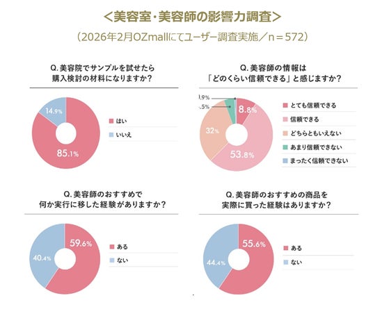 SNSやデジタル広告が主流となる一方で、「実際に試してから購入したい」という消費者ニーズは依然として高く、特に美容・ヘルスケア商材においては“体験”の重要性が増しています。OZmall会員への美容室・美容師の影響力調査では、美容院で商品を試せたら購入検討材料になると回答した人が 85.1%、美容師の情報を「とても信頼できる」「信頼できる」と回答した人が62.6%、美容師のおすすめで何か実行に移した経験があると回答した人が59.6%、美容師のおすすめ商品を購入したことがあると回答した人が55.6%という結果が出ています。